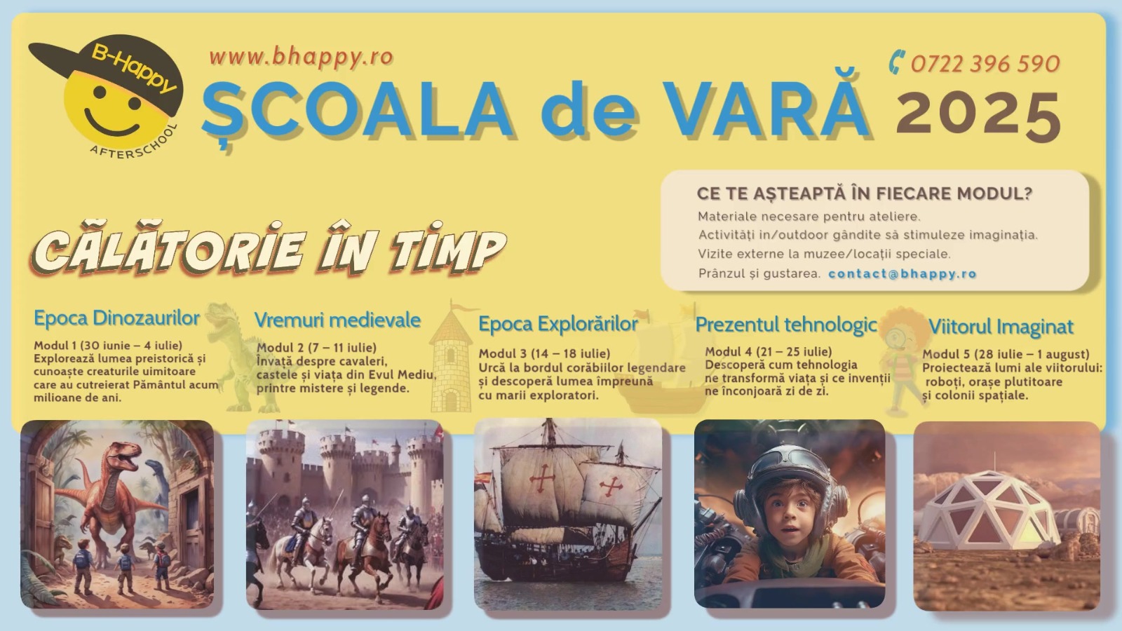 Programa include: activități captivante gândite să-ți satisfacă curiozitățile, materiale necesare pentru ateliere, vizite la muzee sau locații speciale, masa de prânz și gustarea.